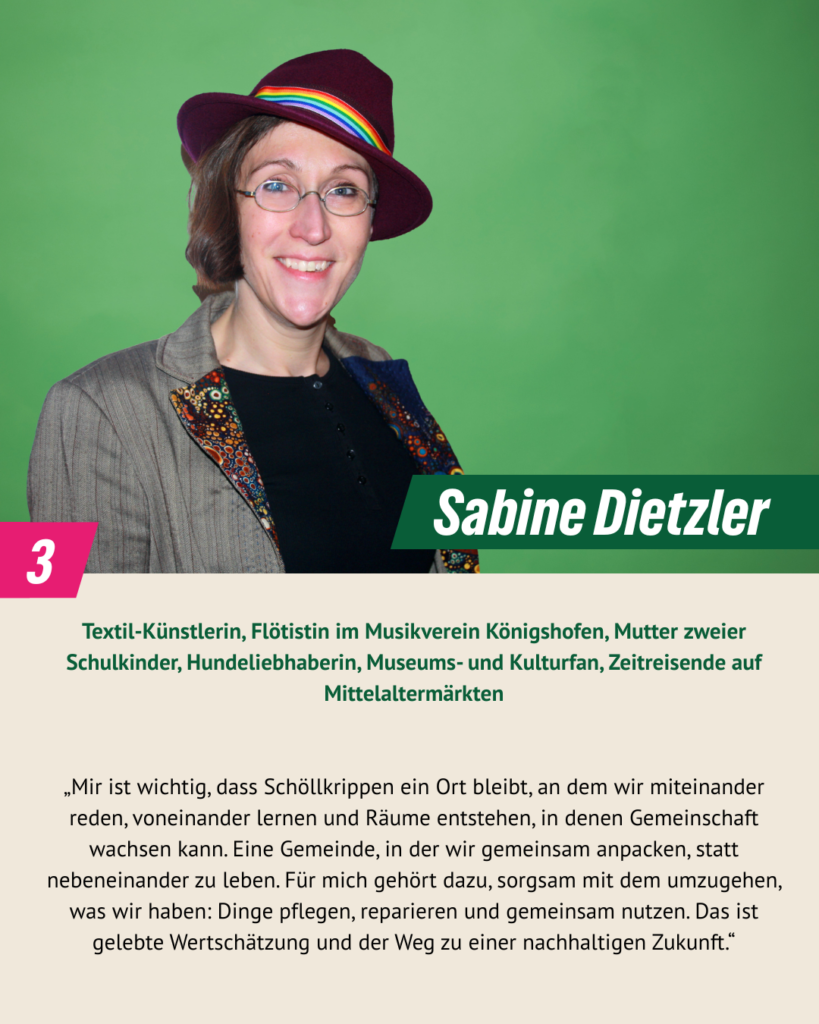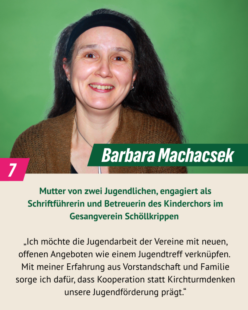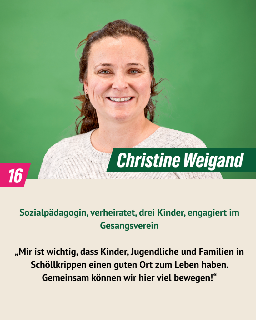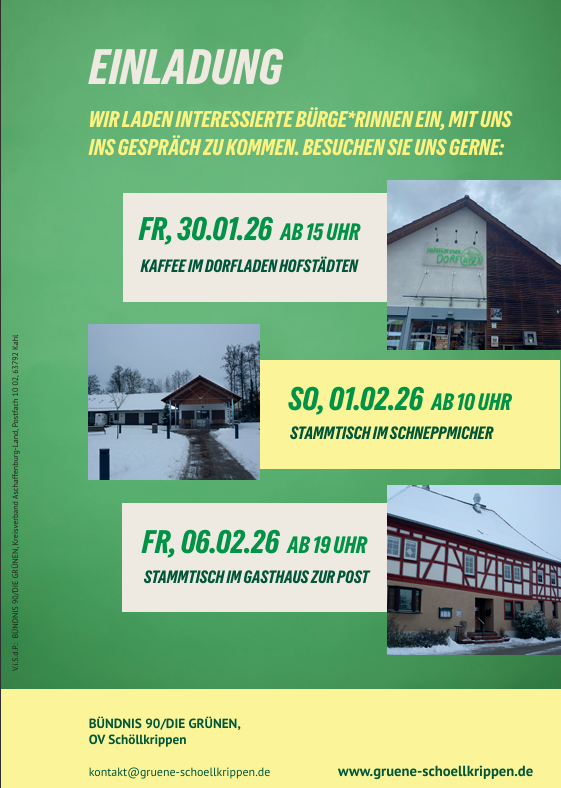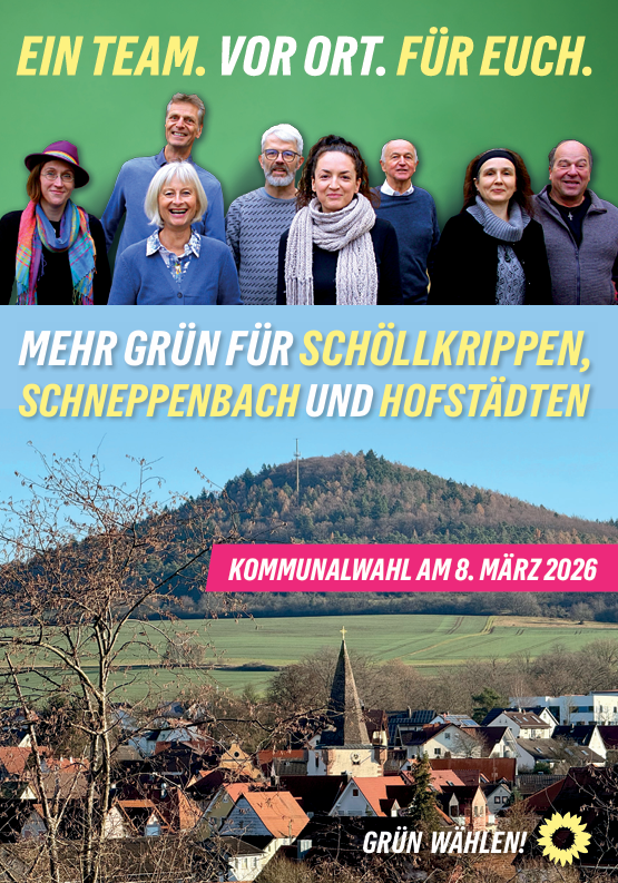 bei der Kommunalwahl 2020 haben wir drei Mandate errungen und sind mit Engagement und Pragmatismus im Gemeinderat gestartet. Wir sind überzeugt: Kommunalpolitik lebt von Beteiligung, Vielfalt und gegenseitigem Respekt. In diesem Sinn wollen wir weitermachen. Dafür stehen auch unsere 16 Kandidat*innen, die am 8. März 2026 zur Kommunalwahl antreten. Wir Grünen wollen Schöllkrippen – unser Zuhause – ökologisch, sozial gerecht und lebenswert weiterentwickeln, für alle Generationen. Wir möchten zuhören, ansprechbar sein und gemeinsam mit den Menschen vor Ort Lösungen finden. Denn lebendige Kommunalpolitik entsteht dort, wo Ideen auf Verantwortung und Mut treffen – mitten in unserer Marktgemeinde.