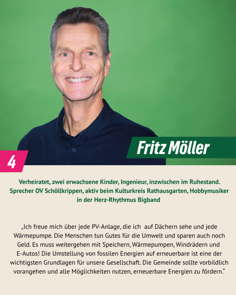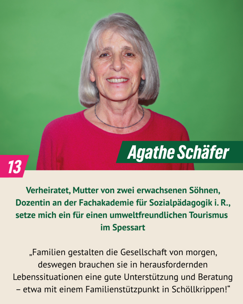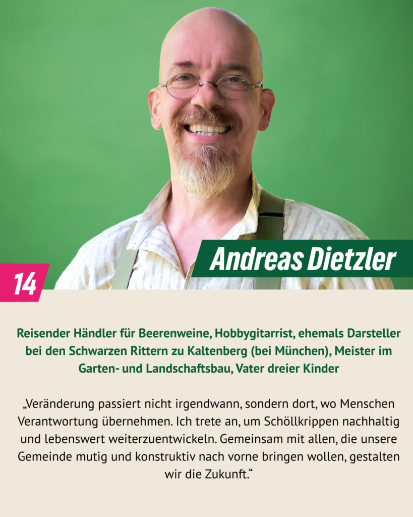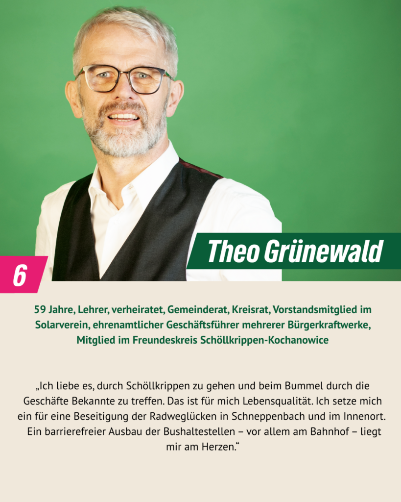 bei der Kommunalwahl 2020 haben wir drei Mandate errungen und sind mit Engagement und Pragmatismus im Gemeinderat gestartet. Wir sind überzeugt: Kommunalpolitik lebt von Beteiligung, Vielfalt und gegenseitigem Respekt. In diesem Sinn wollen wir weitermachen. Dafür stehen auch unsere 16 Kandidat*innen, die am 8. März 2026 zur Kommunalwahl antreten. Wir Grünen wollen Schöllkrippen – unser Zuhause – ökologisch, sozial gerecht und lebenswert weiterentwickeln, für alle Generationen. Wir möchten zuhören, ansprechbar sein und gemeinsam mit den Menschen vor Ort Lösungen finden. Denn lebendige Kommunalpolitik entsteht dort, wo Ideen auf Verantwortung und Mut treffen – mitten in unserer Marktgemeinde.